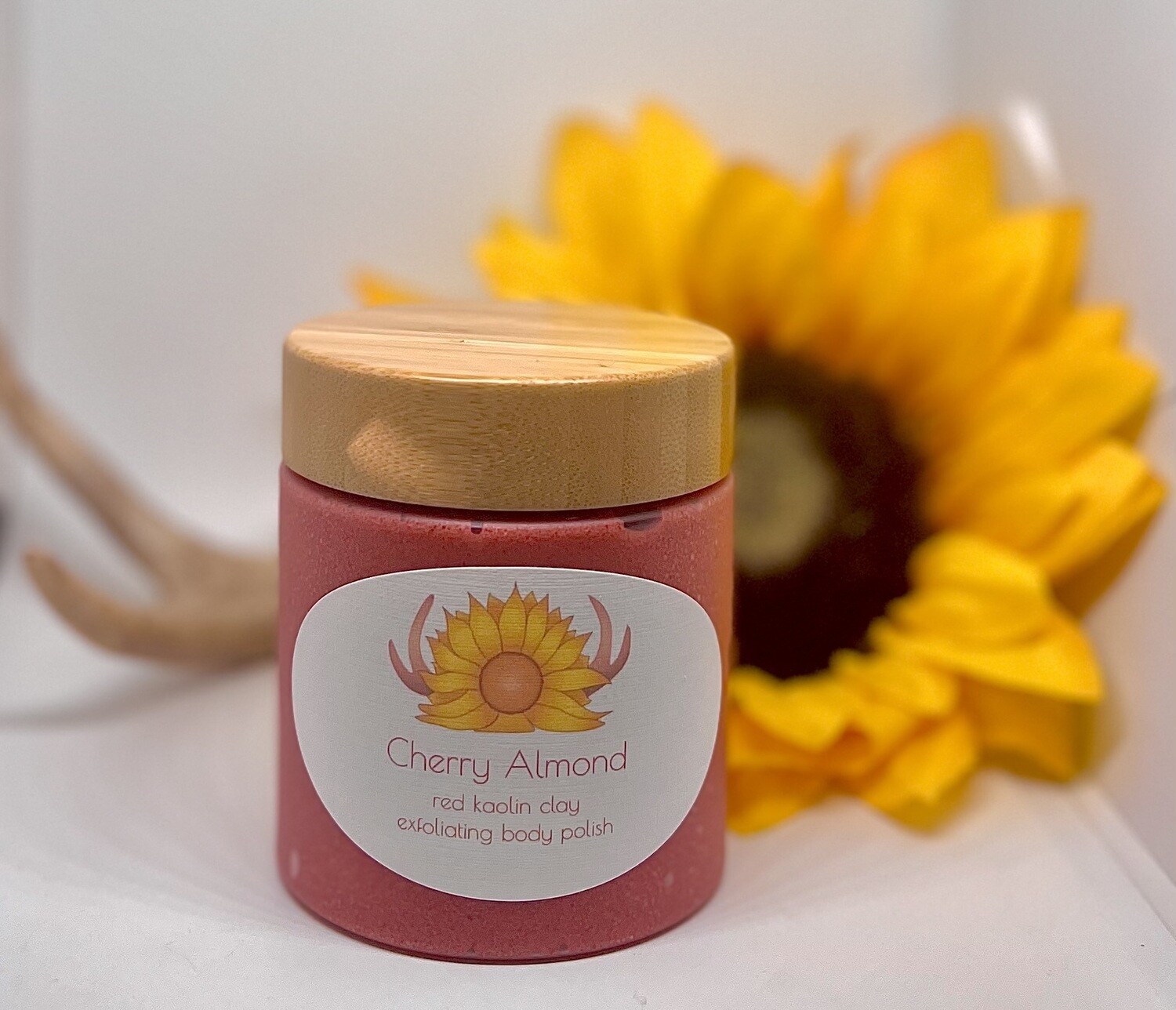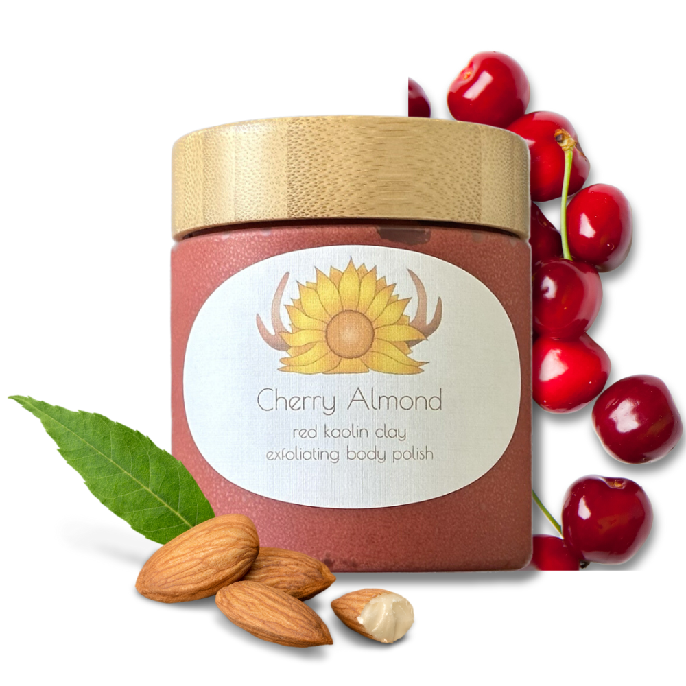 This all natural body exfoliator is made with Moroccan red clay, coconut oil, cherry and almond essential oils and is deeply moisturizing and gently exfoliating leaving skin glowing. Kaolin binds sebum, removes excess oil, and draws out impurities. As you massage it into your skin, this exfoliating clay not only buffs away dead skin cells, it also promotes blood flow to the complexion.