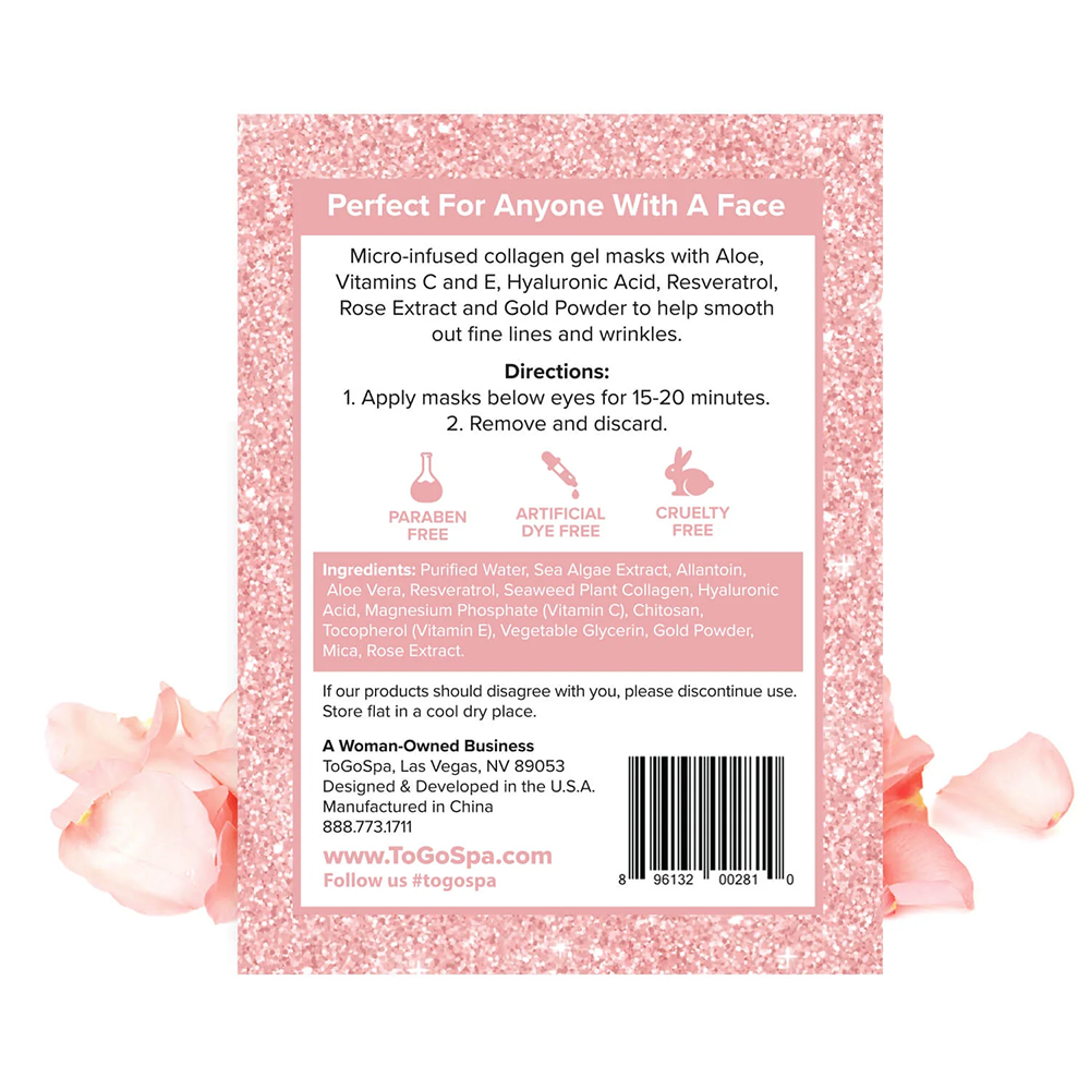 Micro-Infused Collagen Gel Masks with Marine Plant Collagen, Hyaluronic Acid, Aloe Vera, Vitamins C & E, Amino Acids, Resveratrol, Rose Extract and Gold Powder to help smooth out fine lines and wrinkles.